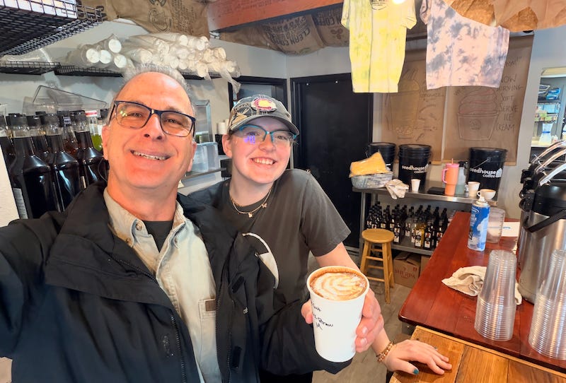 But our daughter doesn’t know who Dave is (I mean, she knows someone named Dave married us, but hadn’t met him in a long time, if ever?). So the ladies at the coffee shop are a bit, um, suspicious. “Why is this old guy asking about Emma?!”